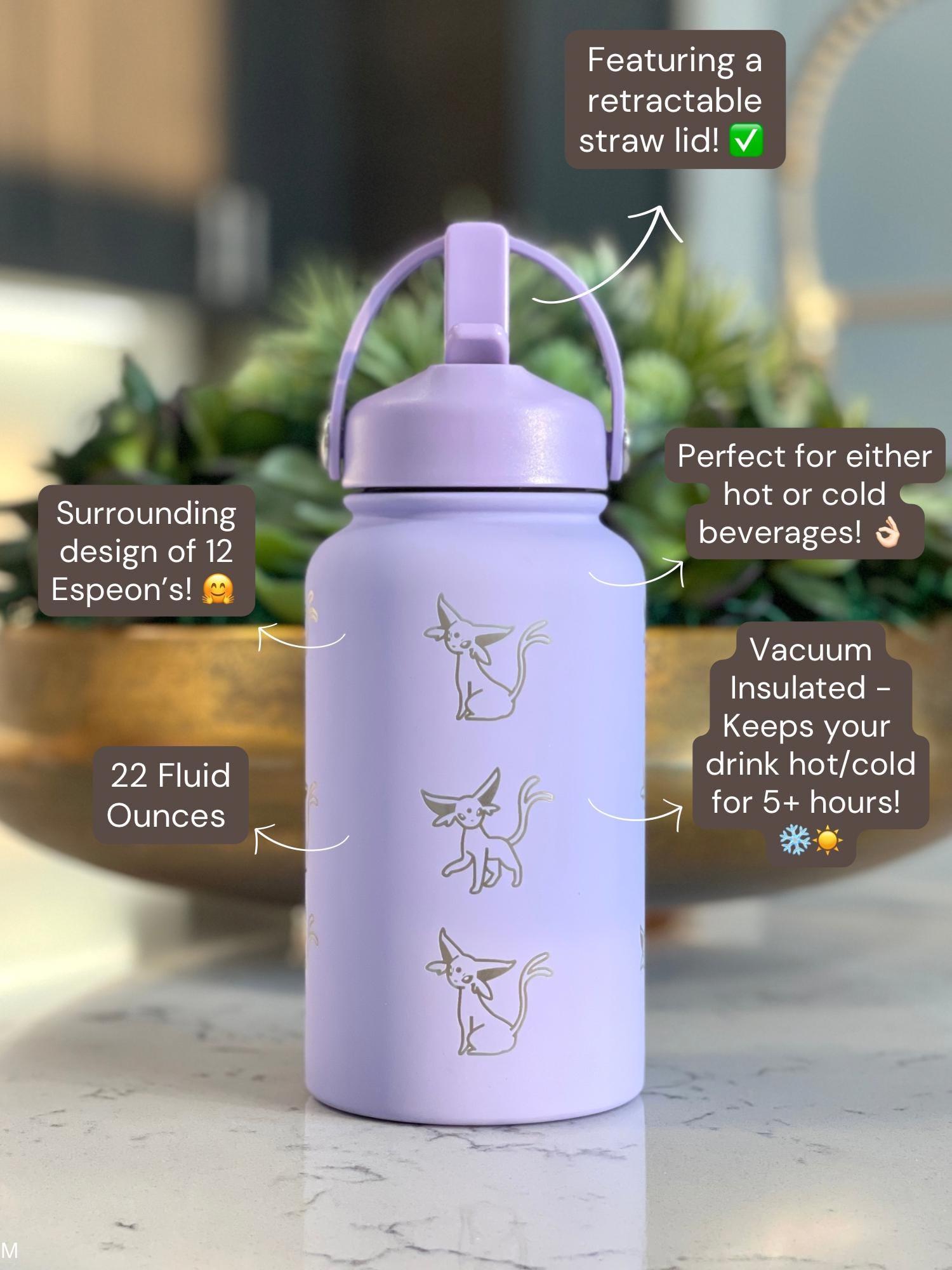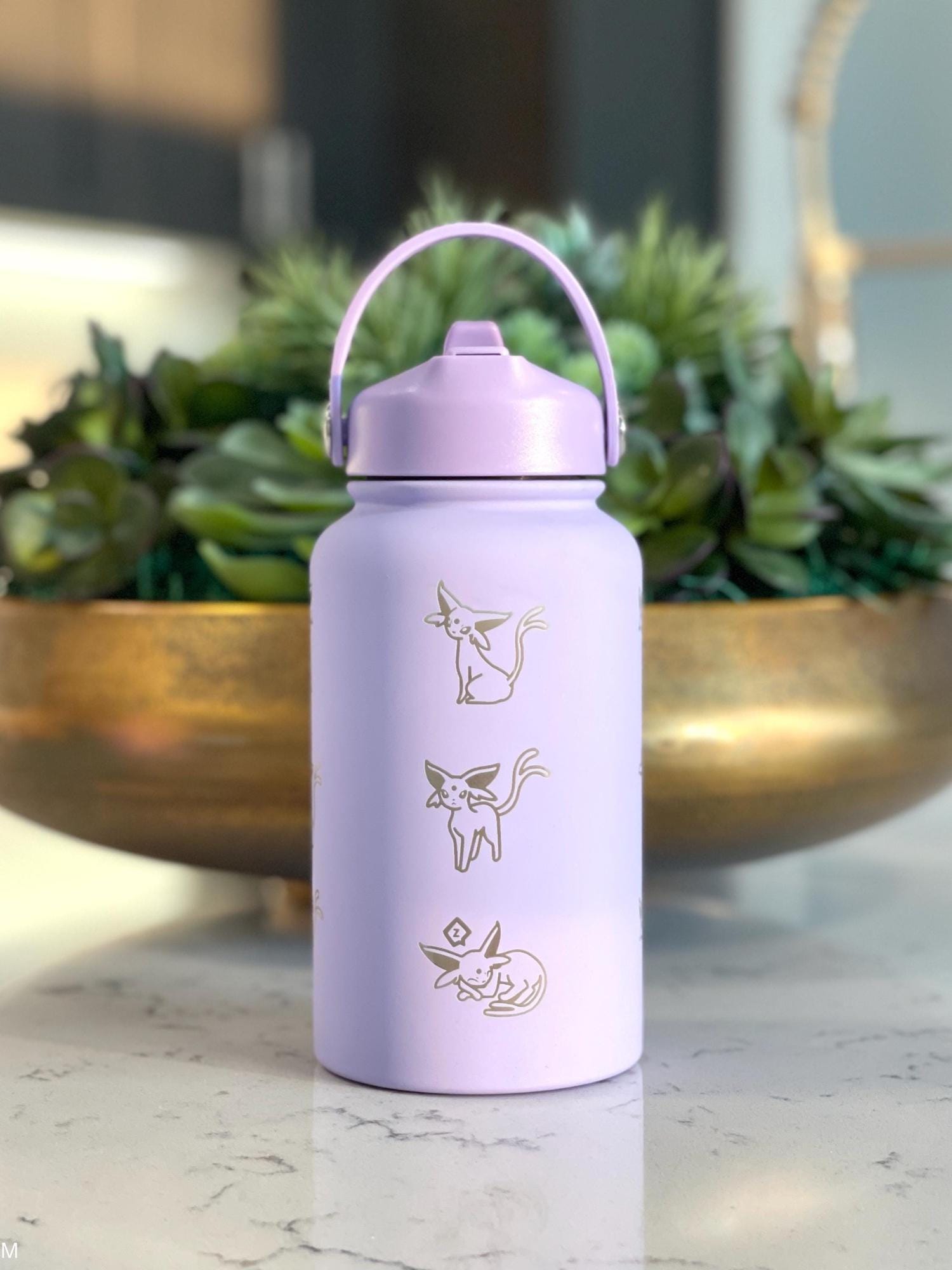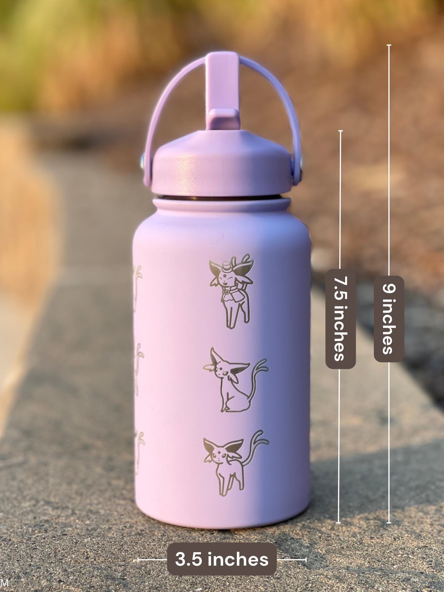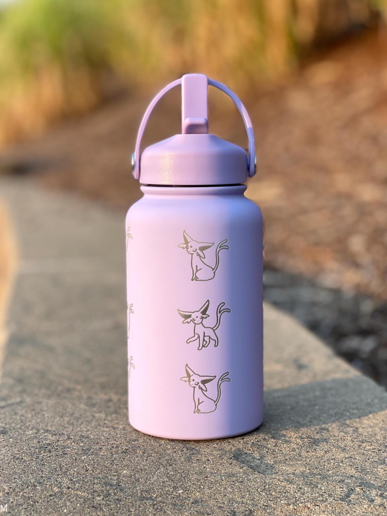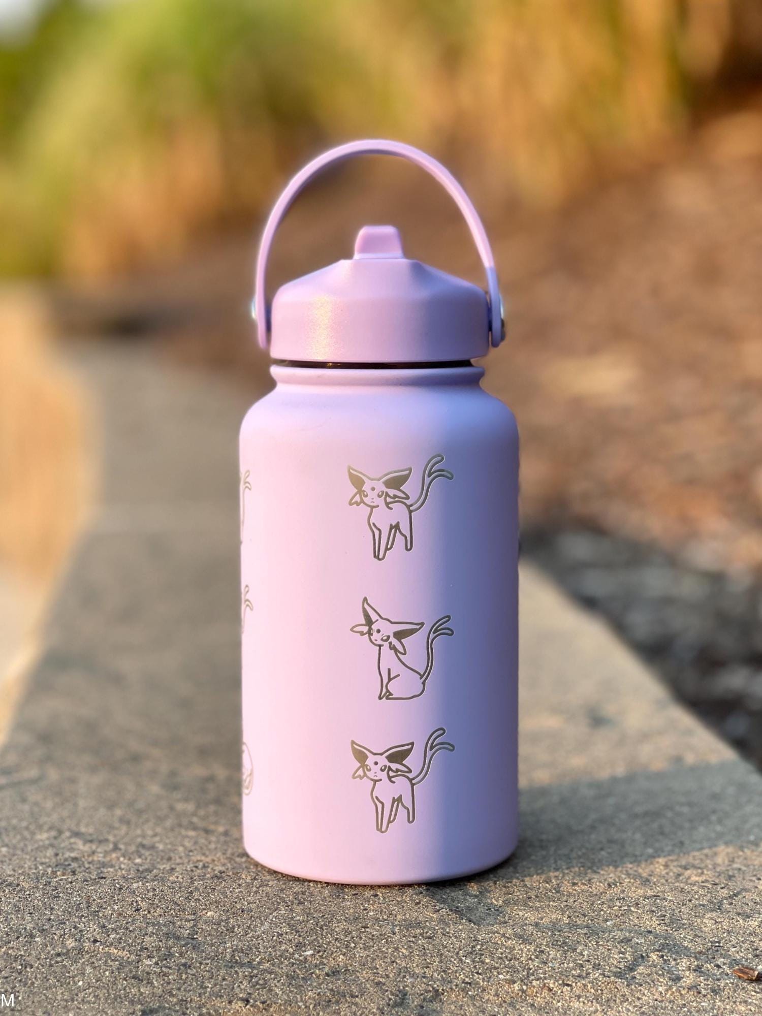 Espeon Straw Water Bottle Engraved Coffee Tumbler with Unite Tuxedo Style & Top Hat Waterbottle, Psychic Eeveelution Anime Fan Birthday Gift