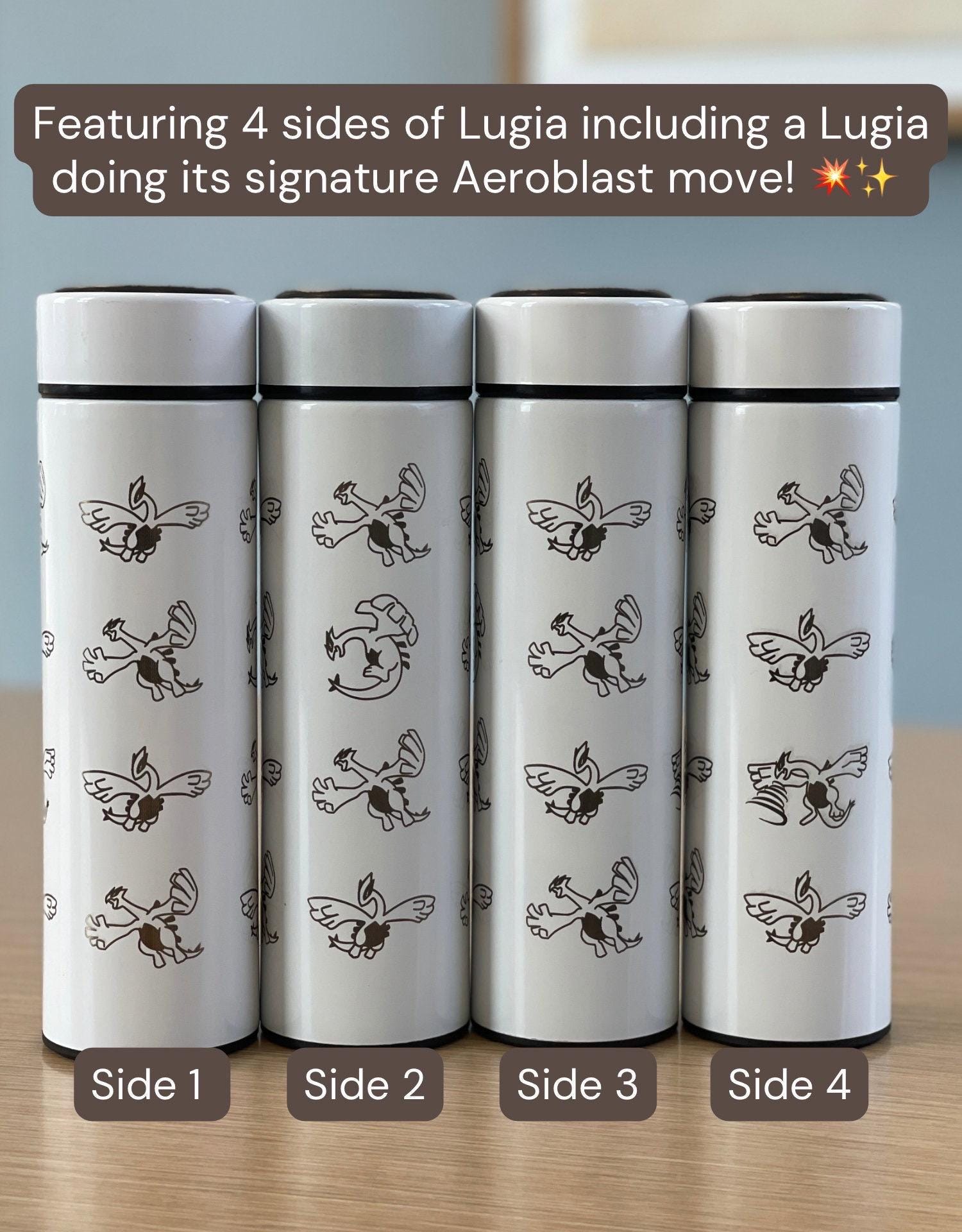 Lugia Coffee Tumbler Engraved Waterbottle with Tea Infuser, Aeroblast Move, Johto Legendary Pokemon Gale of Darkness Travel Mug Cup Gift