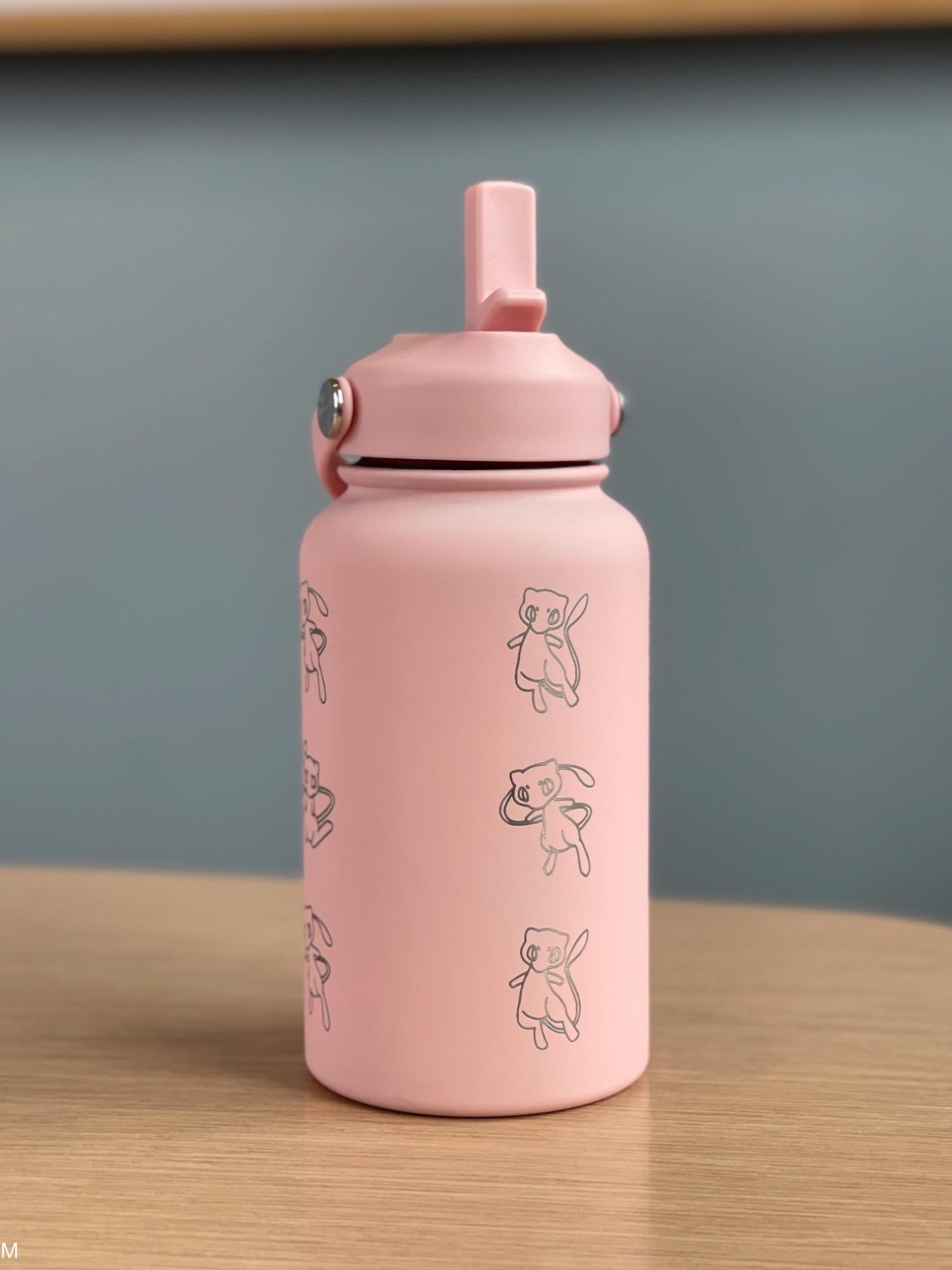 Mew Engraved Waterbottle Coffee Tumbler with Ash Ketchum Hat, Mythical Kanto Thermos Water Bottle Travel Mug Anniversary Birthday Gift