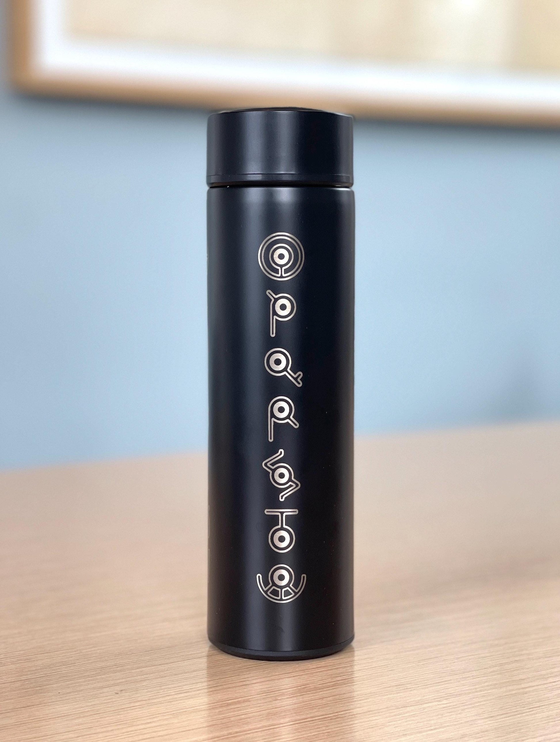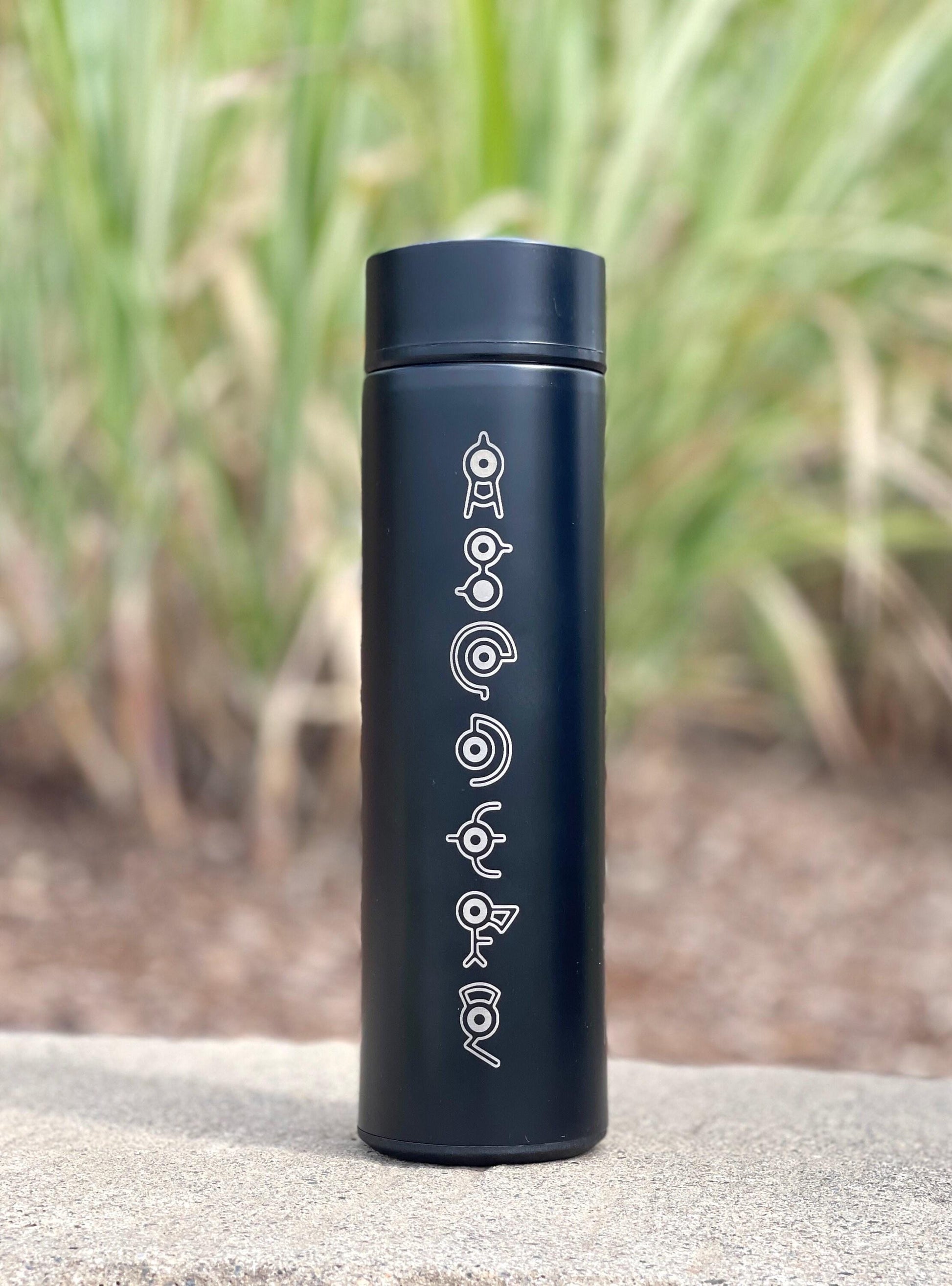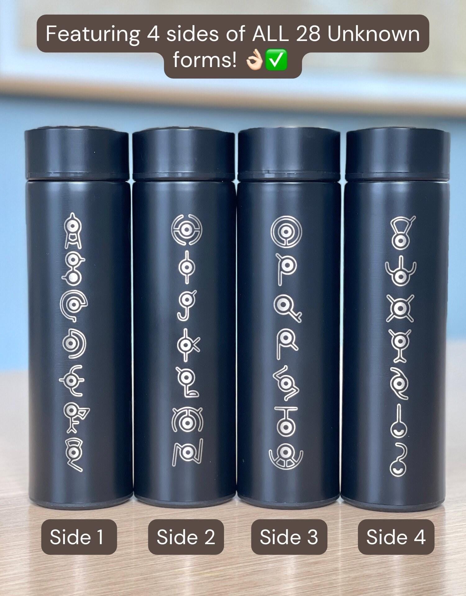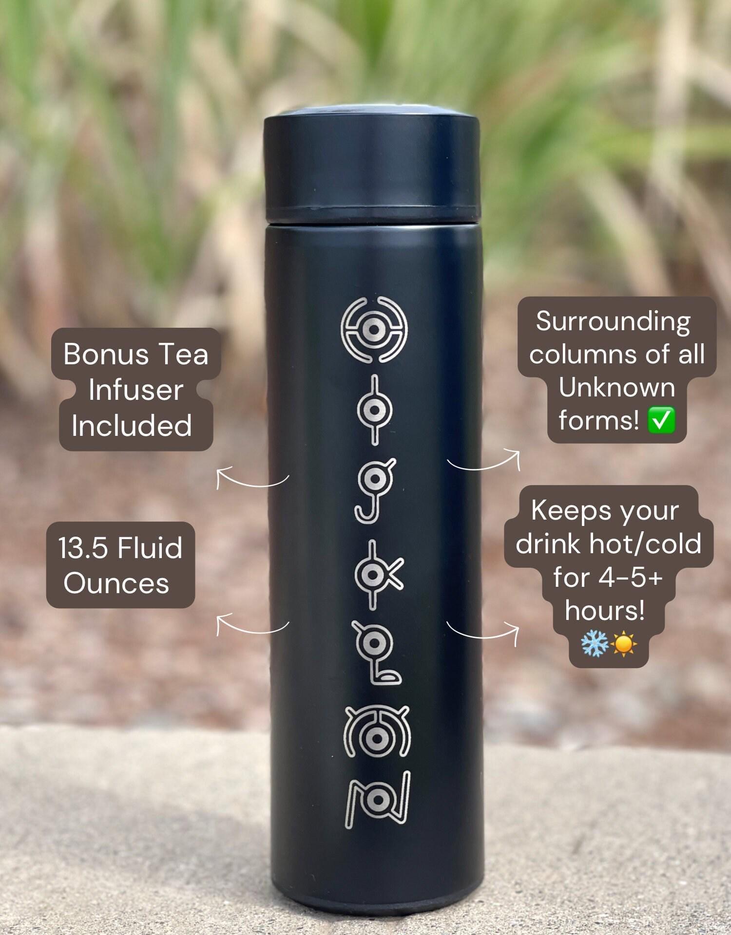 Unown Coffee Tumbler, Engraved “Unown Alphabet” Waterbottle with Tea Infuser, Unknown Anime Fan Travel Mug Cup Water Bottle Flask Gift