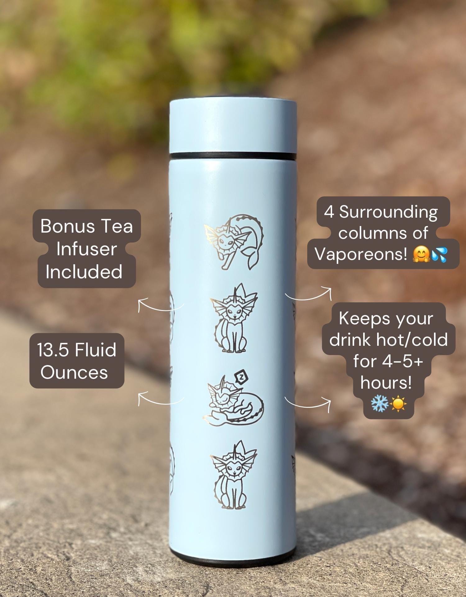 Vaporeon Coffee Tumbler with Tea Infuser, Vaporeon Water Gun & Cafe Top Hat Engraved Waterbottle, Eeveelution Anime Fan Birthday Gift